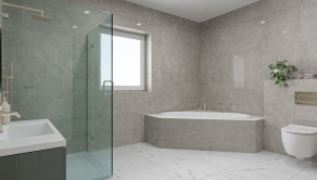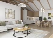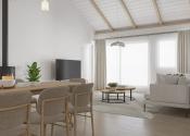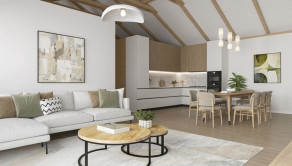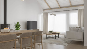Vstupná časť 3 izby, kúpeľňa s toaletou, denná zóna : priestranná obývačka spojená s kuchyňou - strop 5,5 m, zadná časť: kúpeľňa s toaletou, spálňa – ostatné miestnosti strop 3m.
